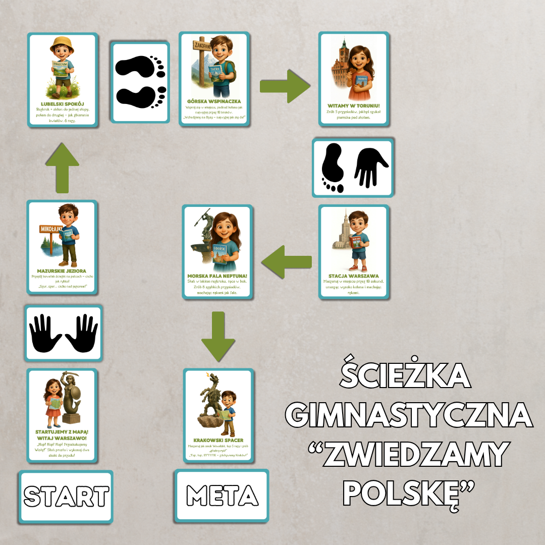 2. Ścieżka gimnastyczna „Zwiedzamy Polskę” – zestaw kart ruchowych, które łączą aktywność fizyczną z podróżą po kraju. Każda karta przedstawia inne miejsce i zadanie ruchowe do wykonania.